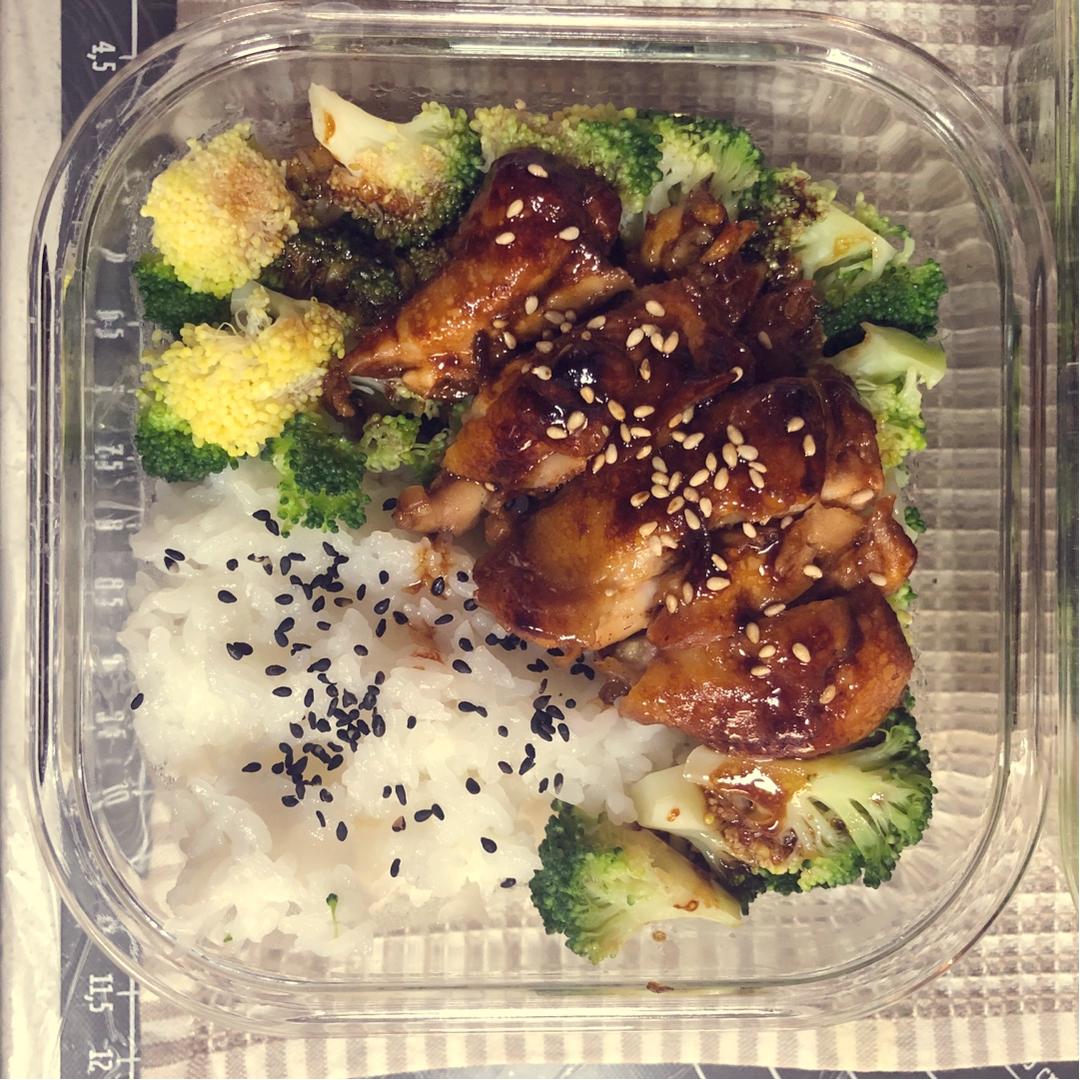早两天团购的鸡腿去骨,煎到金黄,加照烧汁煮5分钟,剩的菠菜用煎鸡腿的油锅炒炒,省油又健康~米饭微波炉两分钟加芝麻在碗里定...