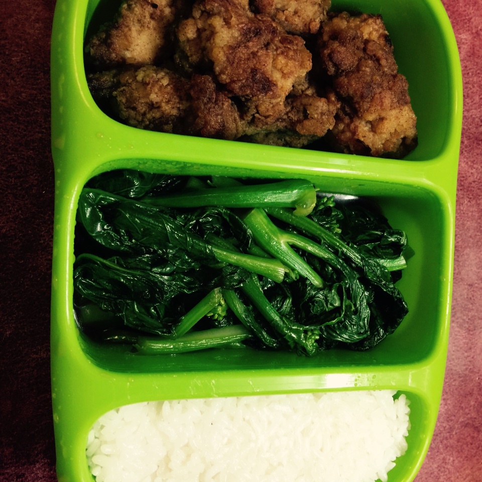 老公的便当。盐酥鸡,蚝油唐芥蓝。
