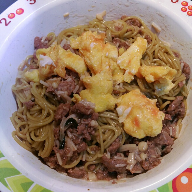 牛肉末金针菇拌面加西红柿炒鸡蛋的浇头,滴了虾仔酱油和麻油。