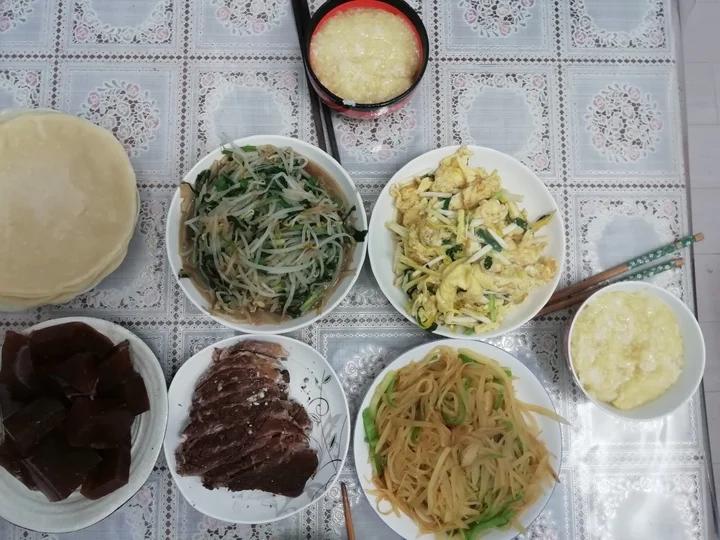 天福号的酱肘子、松仁小肚、蛋清肠,自己蒸的春饼,韭黄炒里脊丝、鸡蛋豆芽粉丝菠菜韭菜...