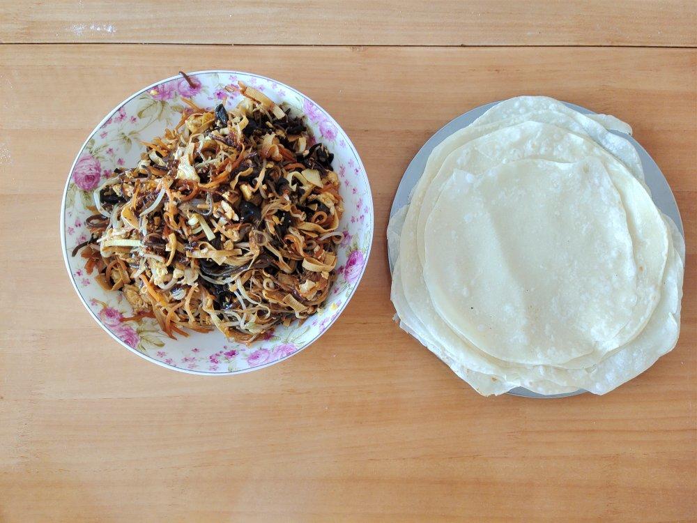 饺子皮做的春饼皮很赞哦!韧性极好包再多都不会裂开👍炒了好几种菜来包,娃儿们很喜欢