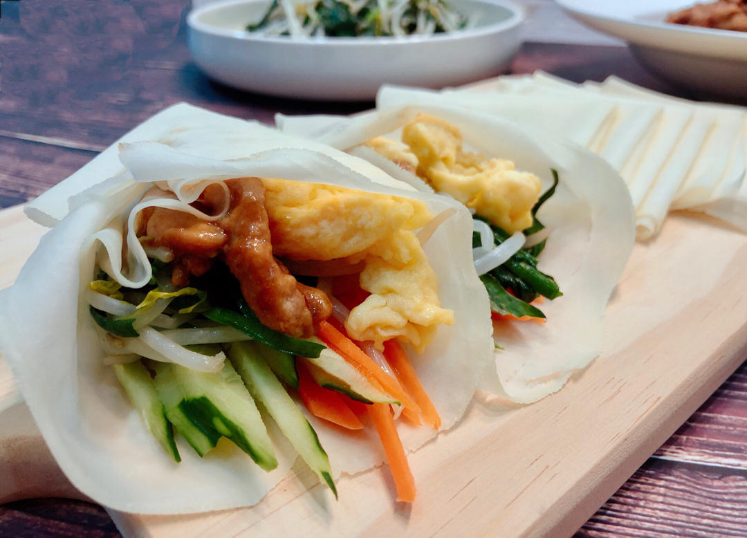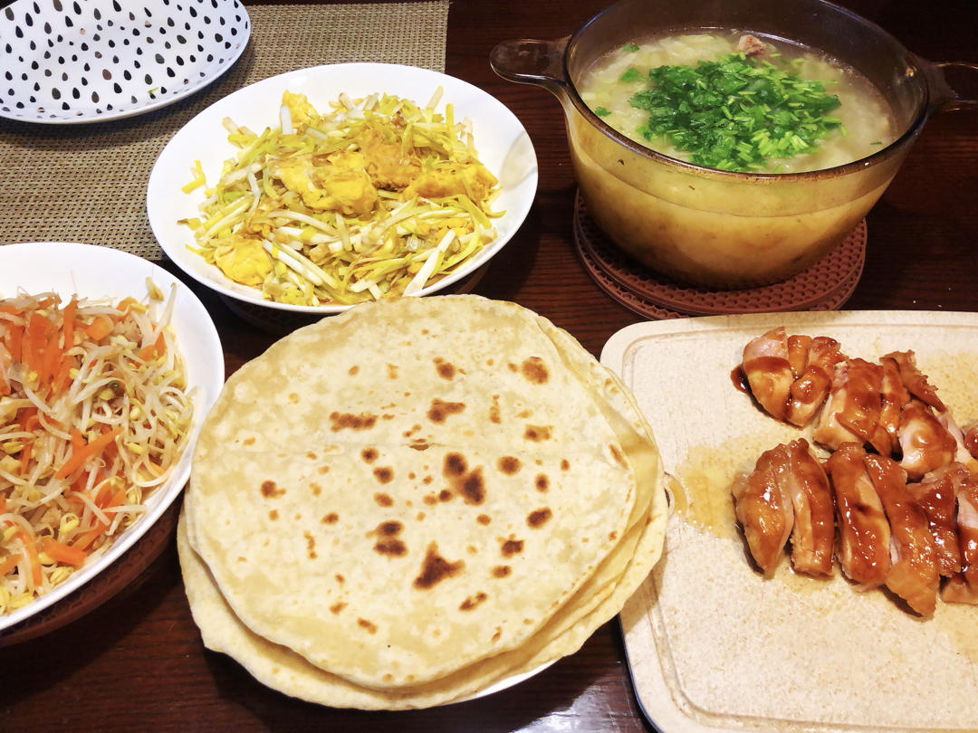 咬春,全麦春饼、鸡蛋韭黄、肉丝豆芽、照烧鸡腿、高汤白菜…寄望全年如这一餐,丰富又健康…