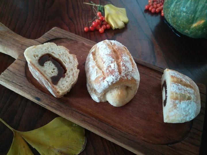 为消耗豆渣做的面包,全麦豆渣夹入豆沙馅。