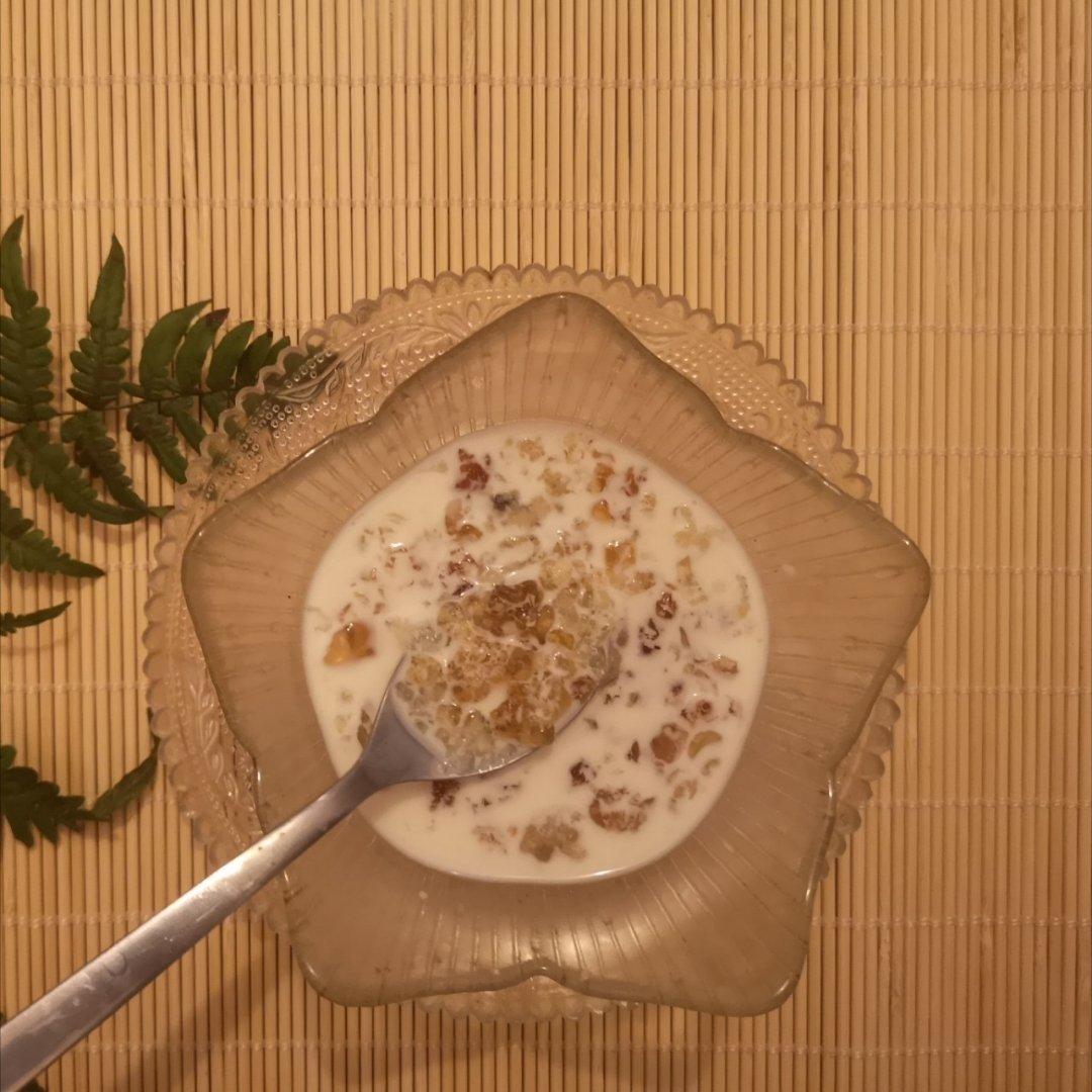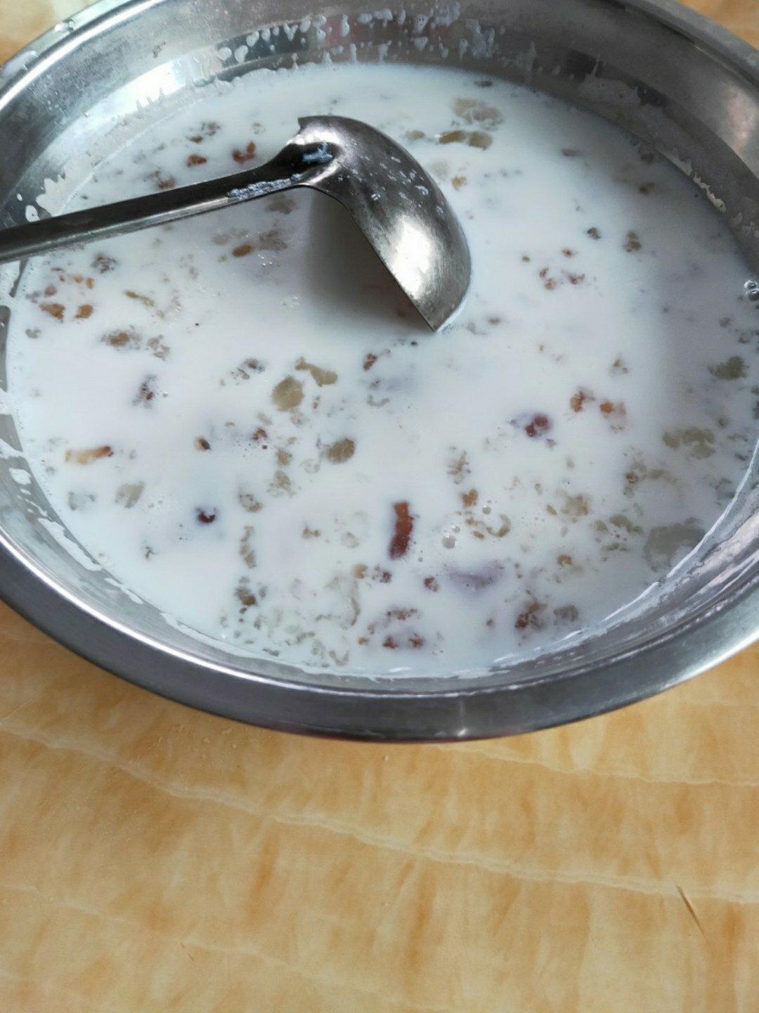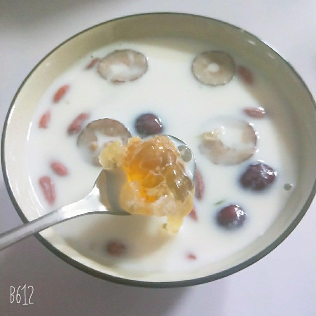 加了红枣枸杞,第一次先高压锅煮桃胶20分钟再加牛奶高压锅15分钟变豆腐渣了,这次...