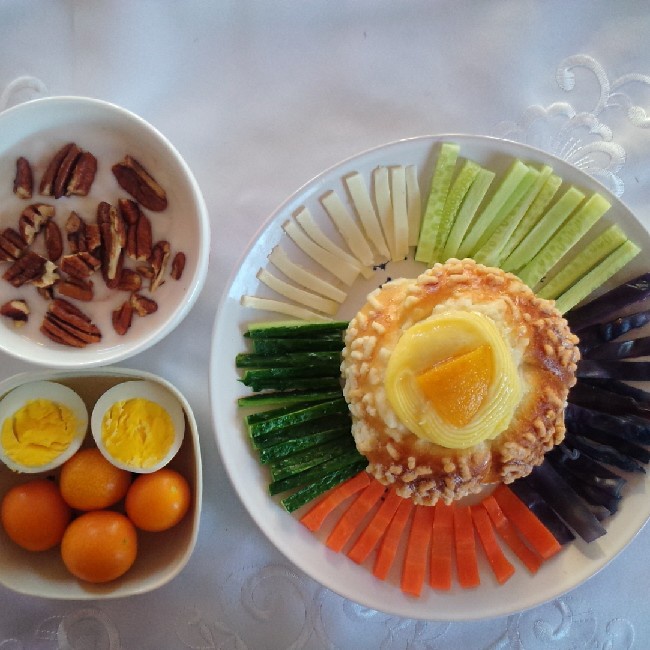 面包蔬菜拼,核桃酸奶,煮鸡蛋,小金桔~每天坚持早餐有...