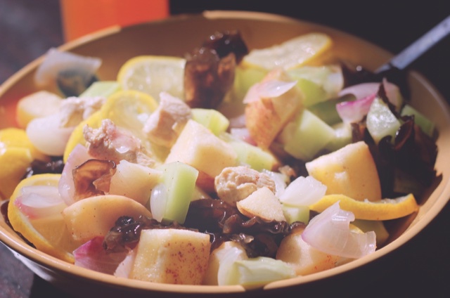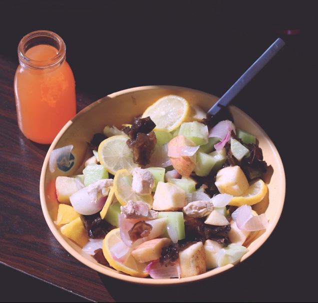 苹果莴苣鸡胸肉黑木耳洋葱柠檬沙拉。