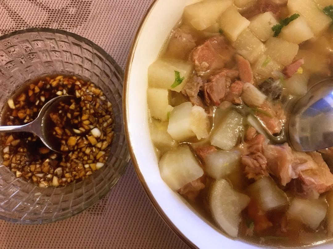 好好吃,先用电压力锅炖的牛肉,后放的萝卜上气10分钟断电,蘸上蒜汁,绝配~