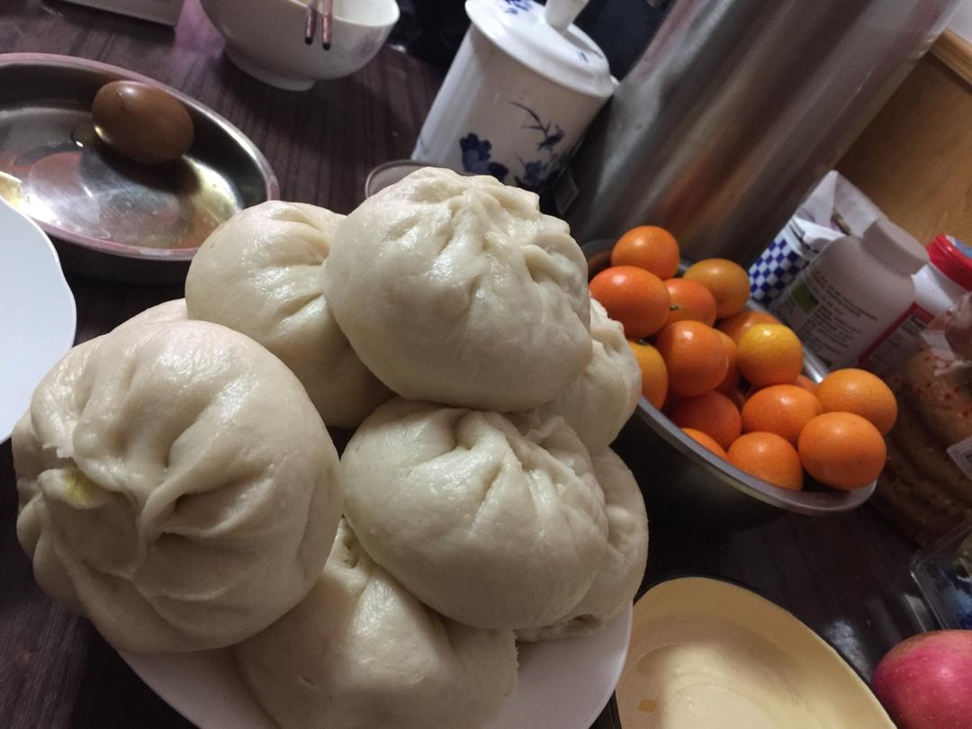 儿子奶奶大清早做好的白菜红烧肉丁包子与萝卜包子。白菜的鲜与红烧肉的香完美融合还不腻👍