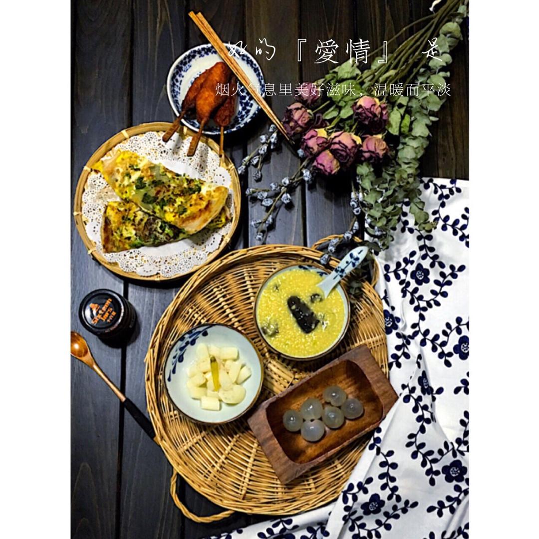 周五早餐:鸡汁小米海参粥,手抓饼版煎饼果子,川香鸡柳,泡椒藕带,龙眼