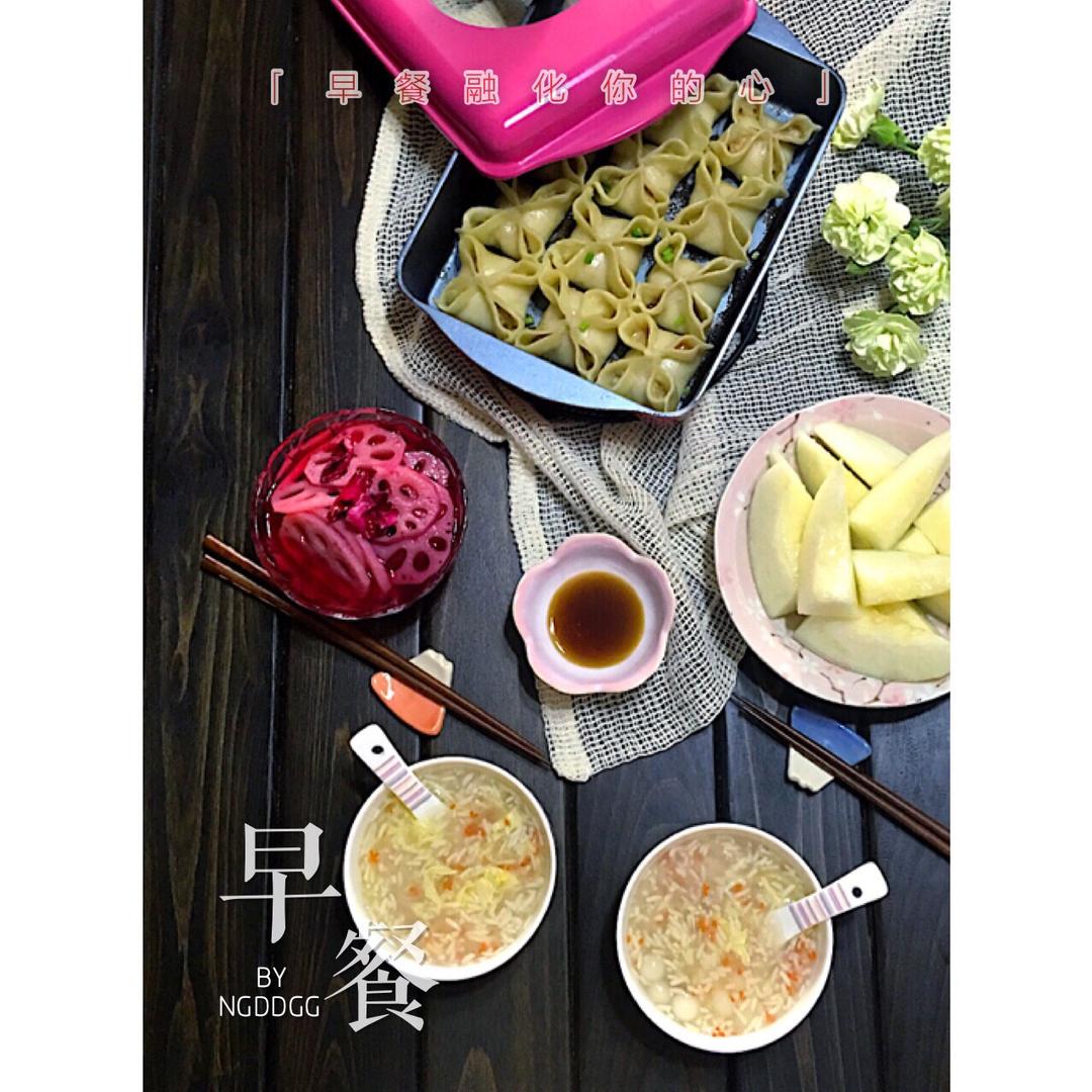 D19早餐:花样四喜生煎饺,玫瑰醋渍藕,桂花藕粉酒酿小圆子,伊丽沙白瓜