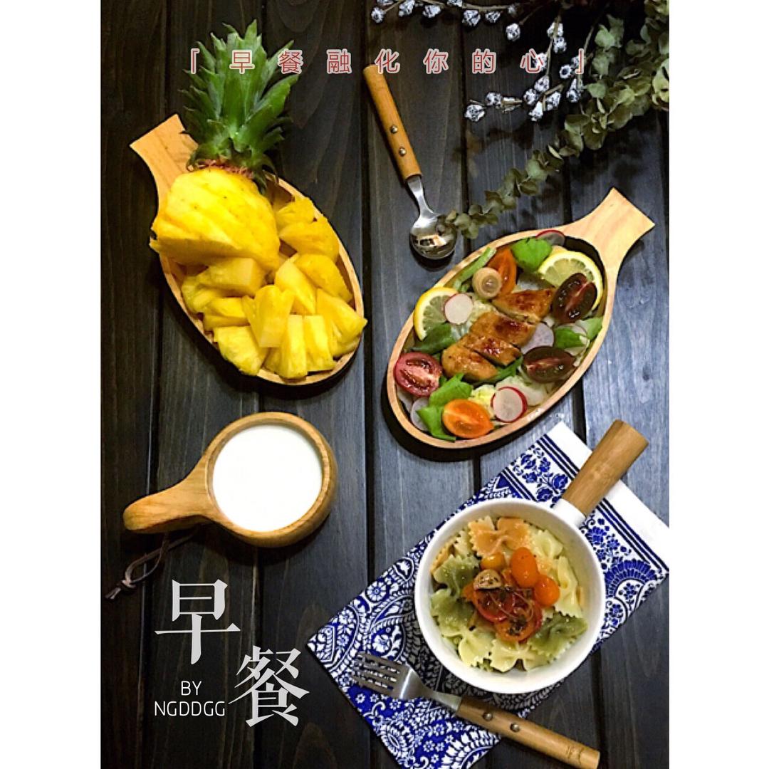 D18早餐:蜜汁煎鸡胸蔬菜沙拉,油浸小番茄蝴蝶意面,骆驼奶,金钻凤梨