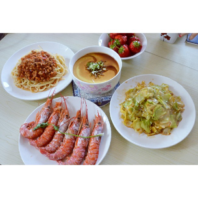中午老公点了「意面+蒸鸡蛋糕+阿根廷红虾」的奇葩搭配,我想喝杂粮粥,就给自己炒了盘火爆大头...