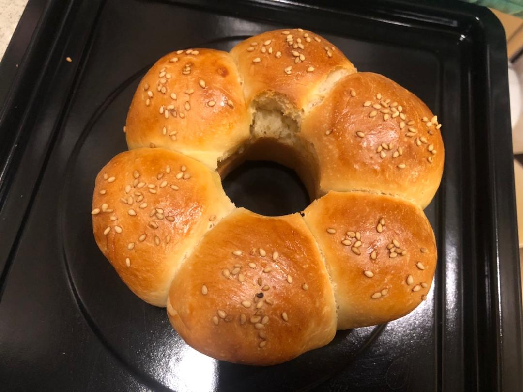第一次的面包就成功了,发酵第一次40分钟,第二次只用了25分钟,需要在烤盘里加一点点水。