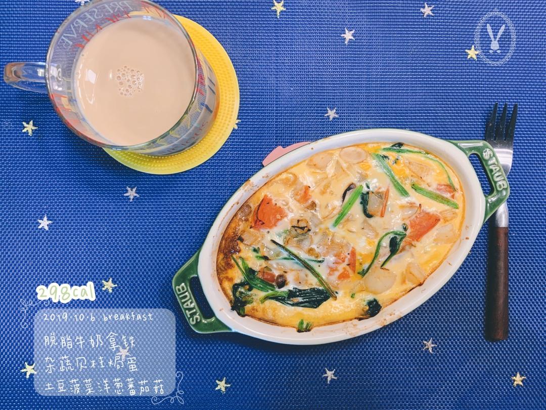 碳水蛋白质蔬菜一锅出,所以特意加了贝柱和烤过的土豆。一个蛋+70ml牛奶,200度20分...