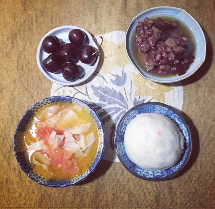 早安,今日食萝卜丝包子,红豆薏仁米红枣汤,西红柿包菜汤,水果食车厘子。