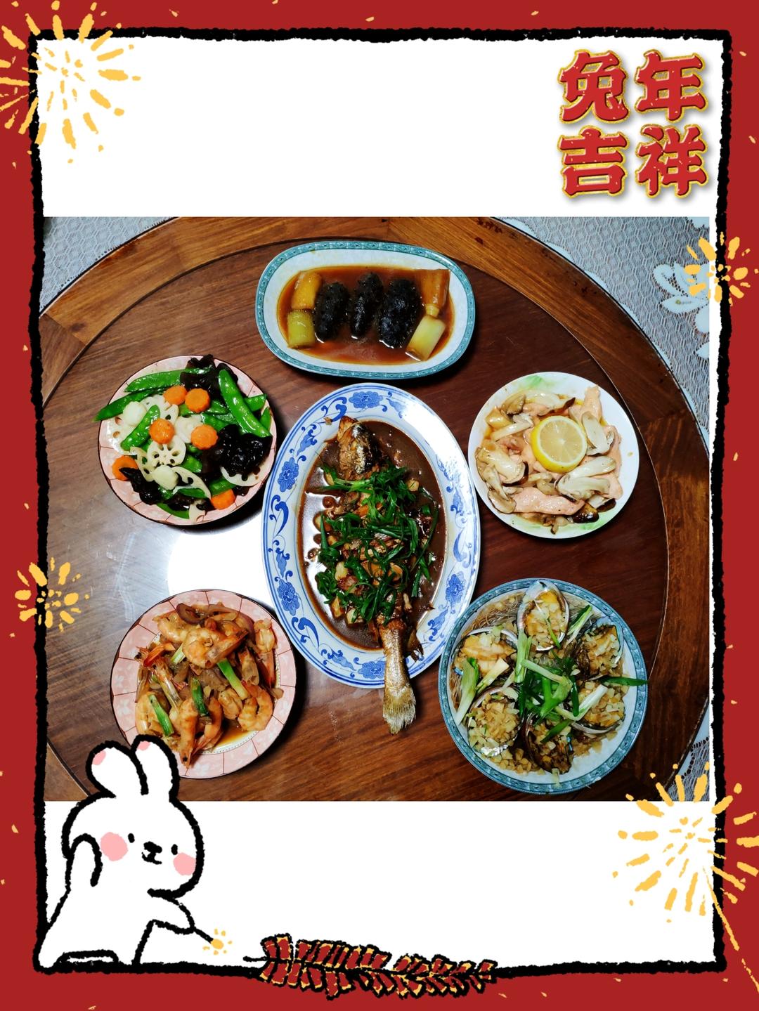 年夜饭:葱烧海参 、 柚香三文鱼赤松茸、粉丝蒸鲍鱼、焗大虾、红烧黄鱼、什锦素菜
