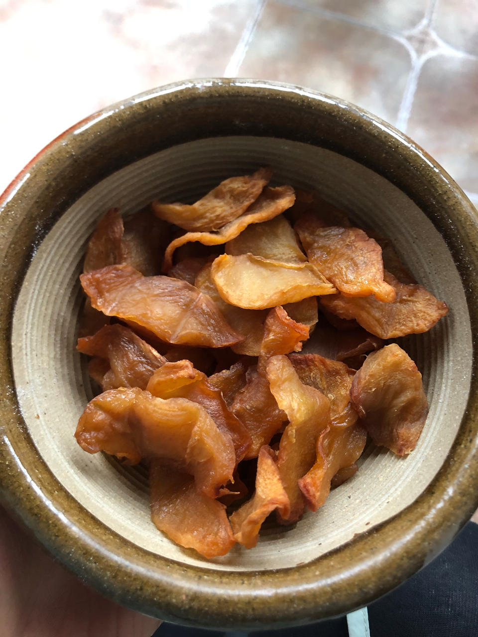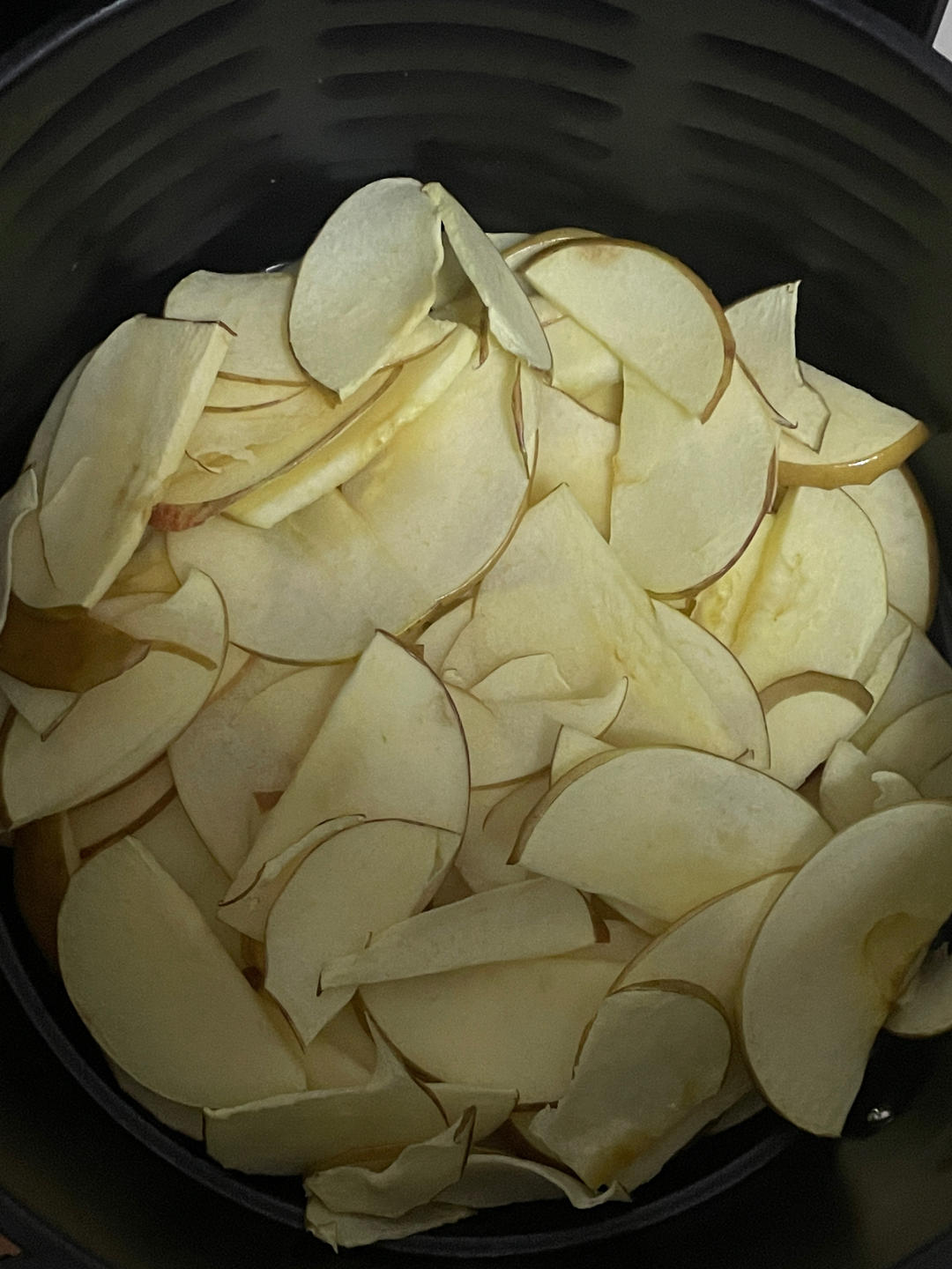 用盐水过了一下,但是不知道是不是烤的太干了,纹理都出来了。薄的入口即化,厚的是脆脆的口感,味道是苹果本身的酸甜 #空气炸...