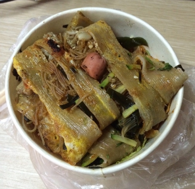 烤冷面,加里脊肉、鸡柳、香肠、2份金针菇、粉丝加加加!