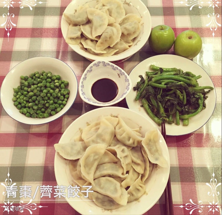 今天主打清新绿。青枣,荠菜饺子,水煮豌豆,炒菜苔。