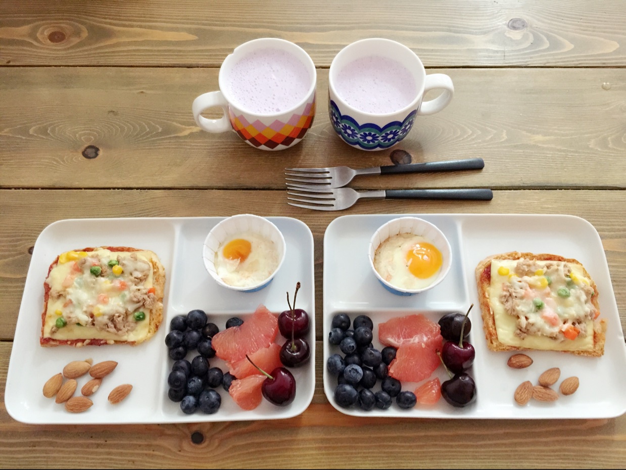 金枪鱼吐司披萨,紫薯牛奶,烤鸡蛋杯