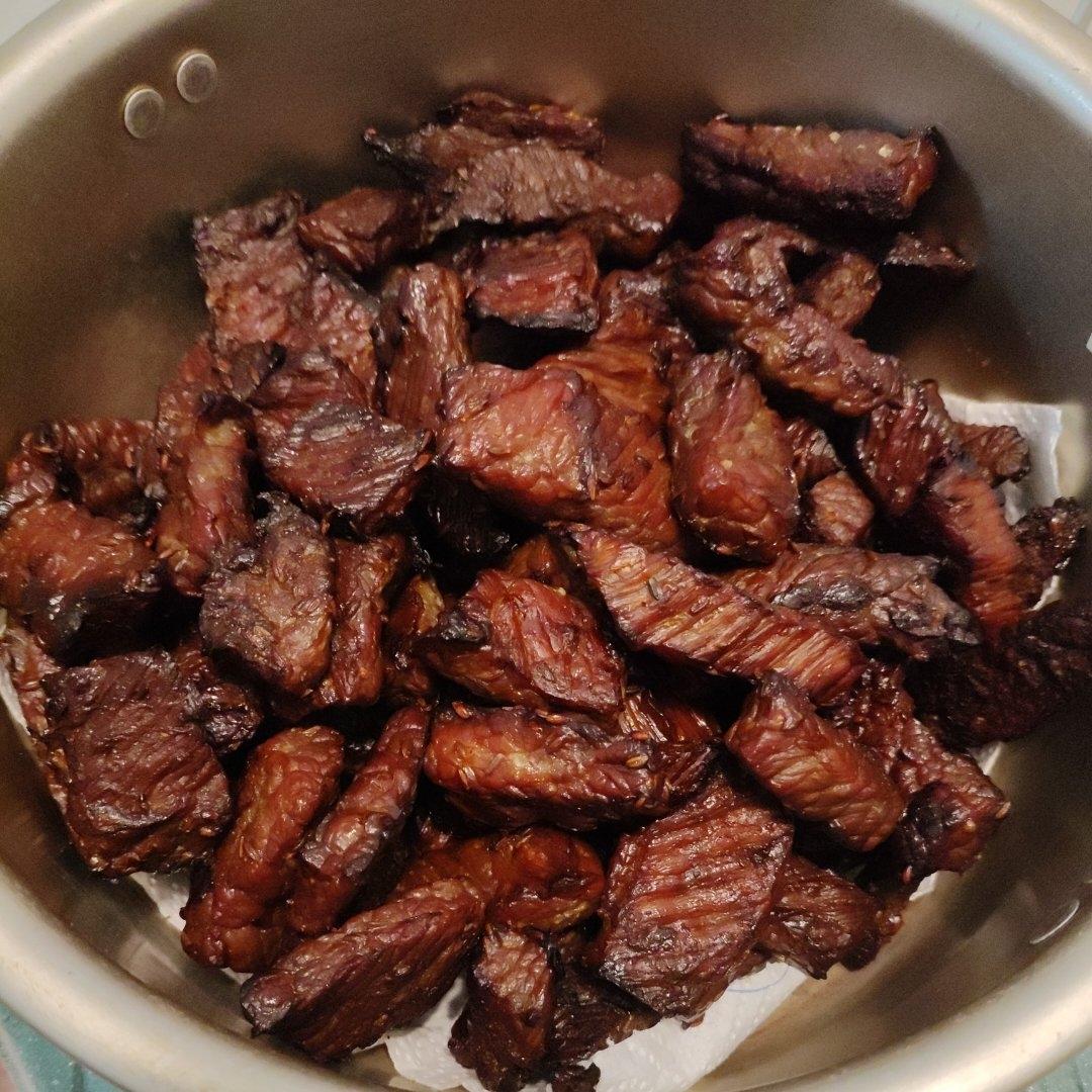 没加红曲粉,一斤肉烤了两盘有点点厚度,孩子喜欢吃干点的,我加了一遍放在烤网上烤5分钟,味道非常不错!