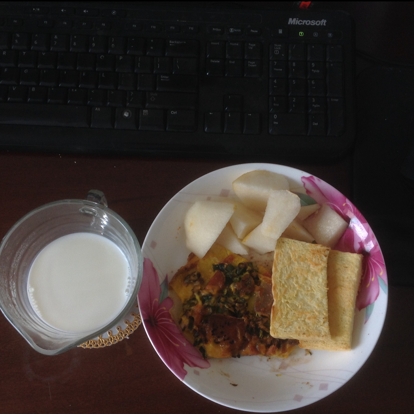 今日早餐:米饭披萨+西葫芦番茄鸡蛋不沙拉+杏仁+低脂奶…