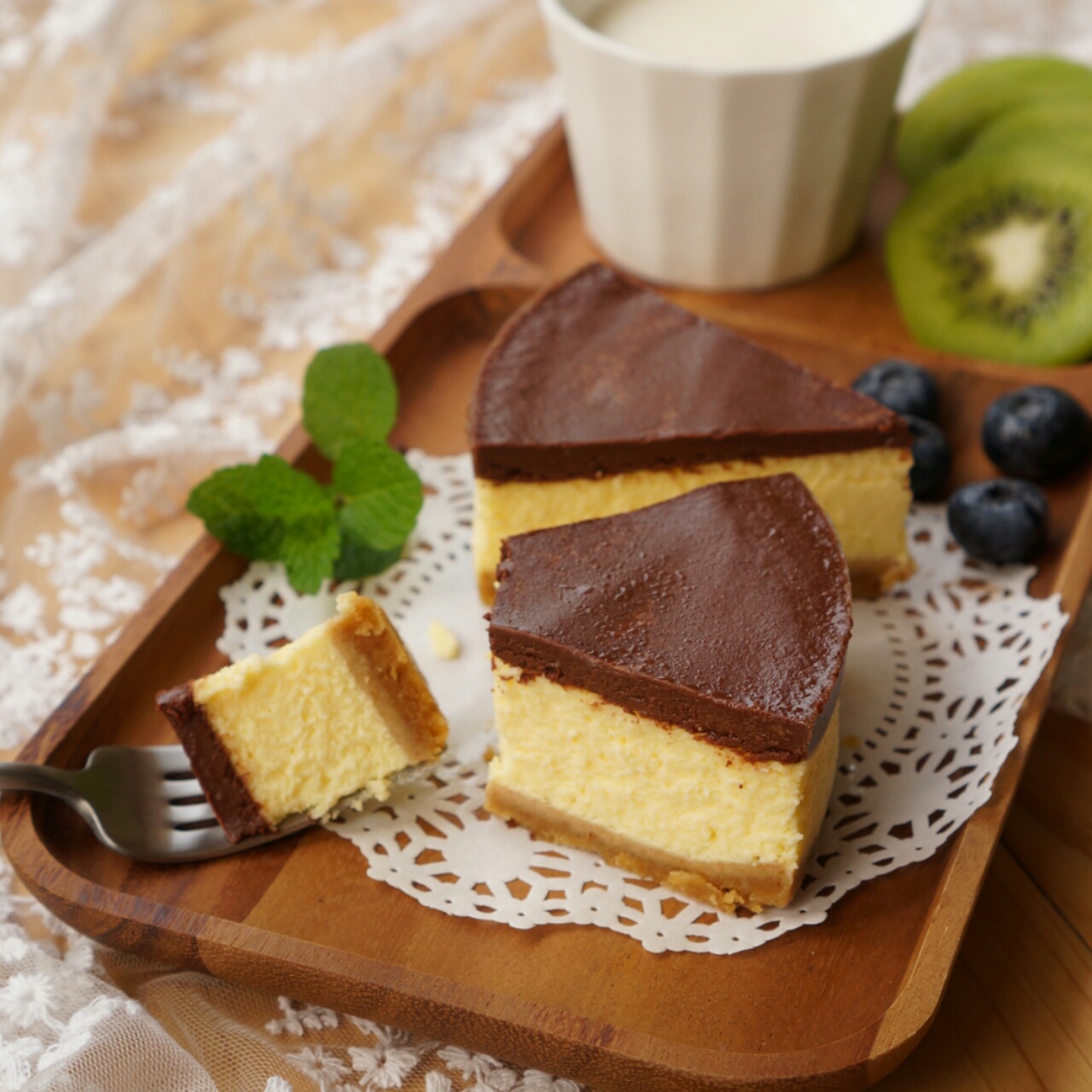 法芙娜做成的巧克力层,微苦~中间芝士糊过筛后变得更加顺滑~最后是消化饼层!丰富而变幻,喜欢...