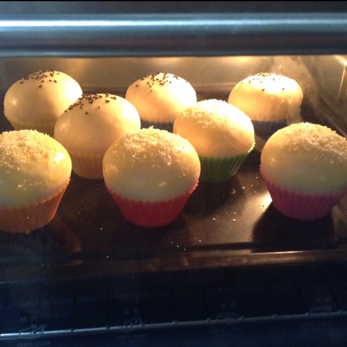 分成了8个,4个花生酱的配芝麻顶儿,4个豆沙馅儿的配椰蓉顶儿,开始烘烤,希望成功!