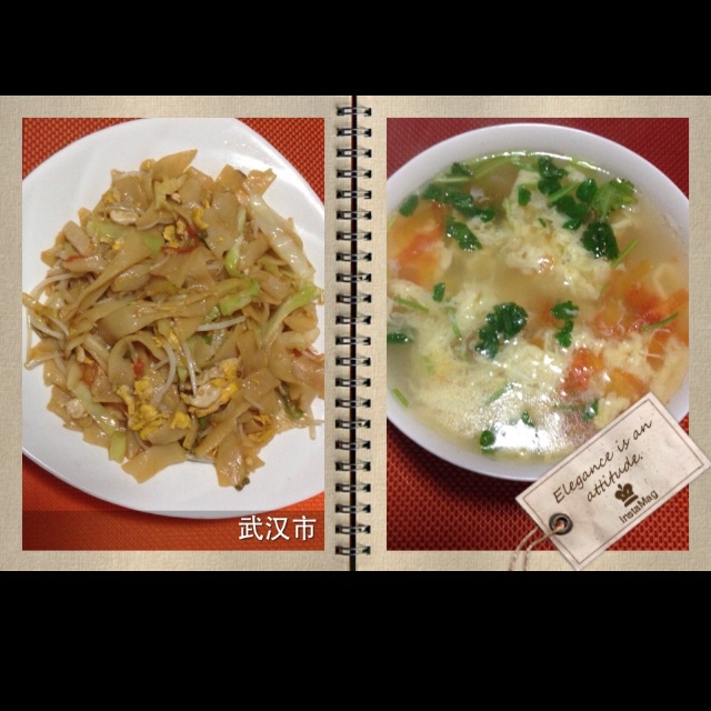 素炒河粉,西红柿蛋花汤。