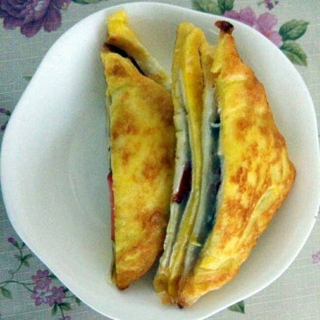 跟堂妈做美味西多士,可惜没有芝士只有火腿和果酱,味道超级棒,儿子说是最好吃的三明治。