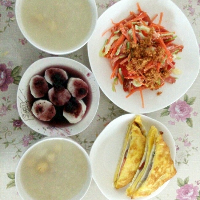 早餐美味西多士,蓝莓酱山药,蔬菜沙拉,百合莲子粥。幸福的一天从早餐开始,今天要到外边工作。