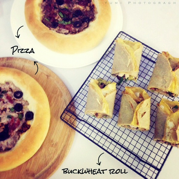 做了俩披萨,一堆荞麦饼肉菜卷