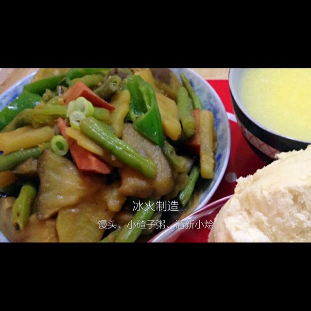 馒头、小碴子粥、清新小烩[得意]