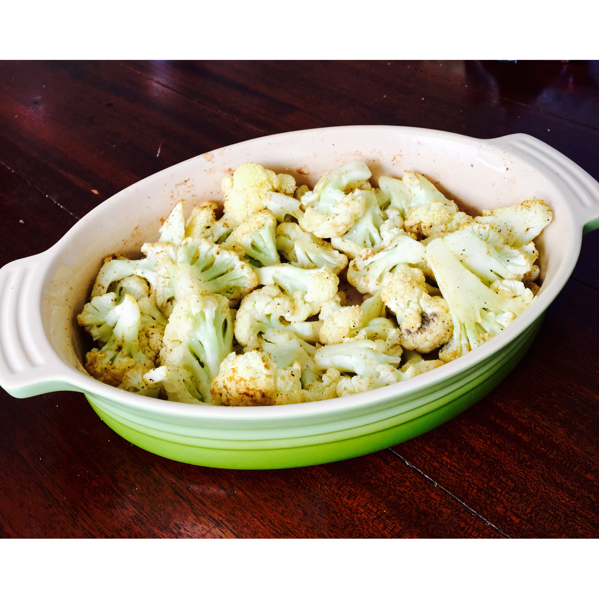 晒新锅~ 渐变绿的le creuset,超喜欢~ 烤花菜一盘正正好~