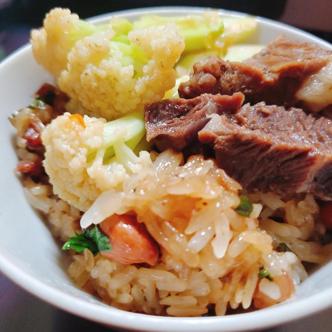 今天煮了糯米饭,花生也不错,还有椰菜花和焖牛腩