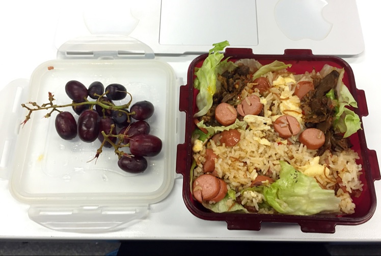 XO酱火腿蛋炒饭+葡萄,生菜垫底真是最爱的便当底,好吃又方便
