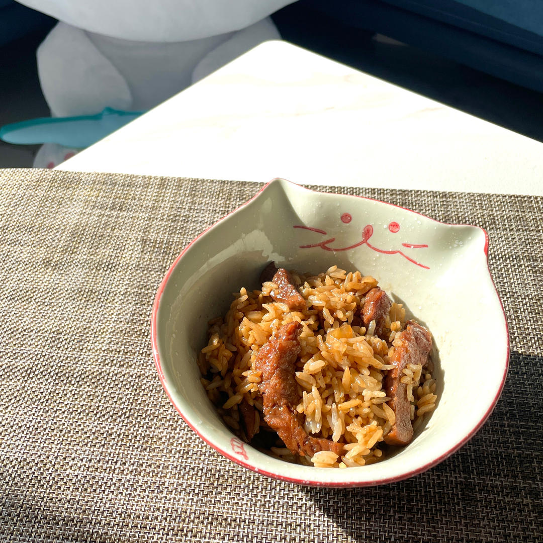 牛肉做好等汁水变少后,放入米饭一起翻炒~