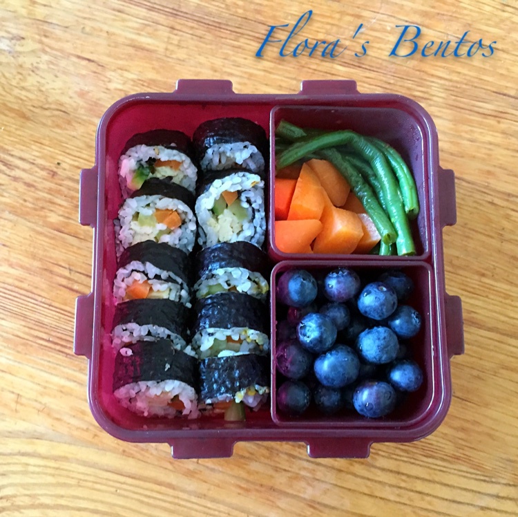 紫菜包饭+水煮胡萝卜+蓝莓,还有几根早上豆角焖面里没吃完的豆角,又一款适合冷吃的便当~