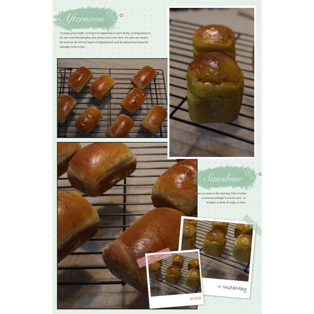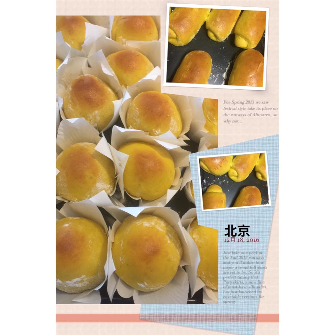 脑残如我,昨晚不知怎么想的,揉了俩大大的南瓜面团:今天忙忙乱乱的烤了豆沙餐包,肉松卷。