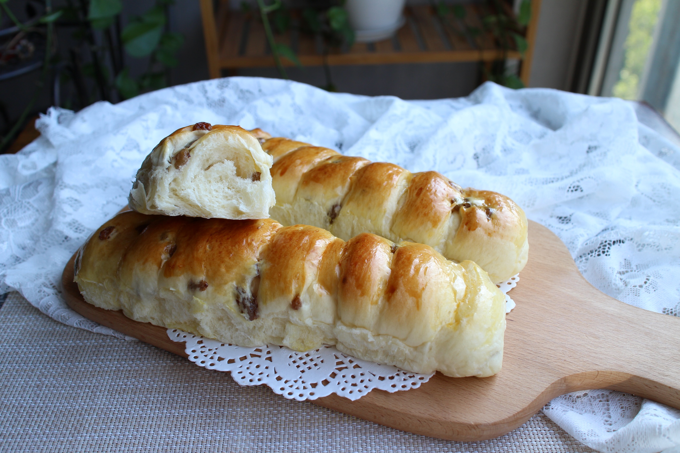 面包配方用的妃娟的中种北海道吐司,所以太软了,不利于整形,不过真的很绵软,拉丝效果很好,而且搭配朗姆酒渍葡萄干,真的挺好...