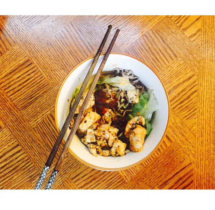 其实就是面+生菜+蒜蓉+煎鸡肉+花生...