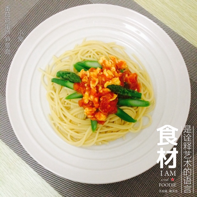 意面的中式做法,番茄鸡蛋芦笋意面,感冒没怎么加盐,吃到最后加了点儿黑胡椒,越吃越好吃,越吃越想吃