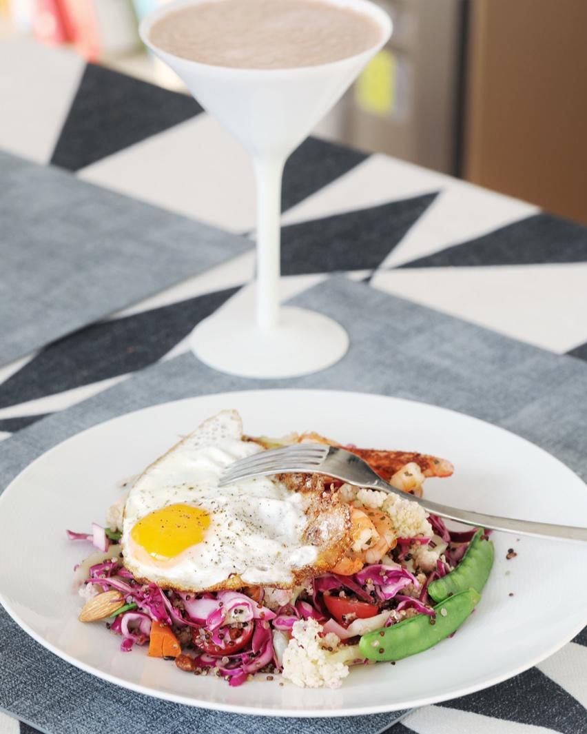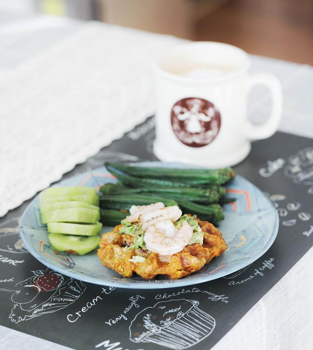 胡萝卜全麦华夫饼配牛油果大虾,白灼秋葵,猕猴桃,拿铁咖啡。