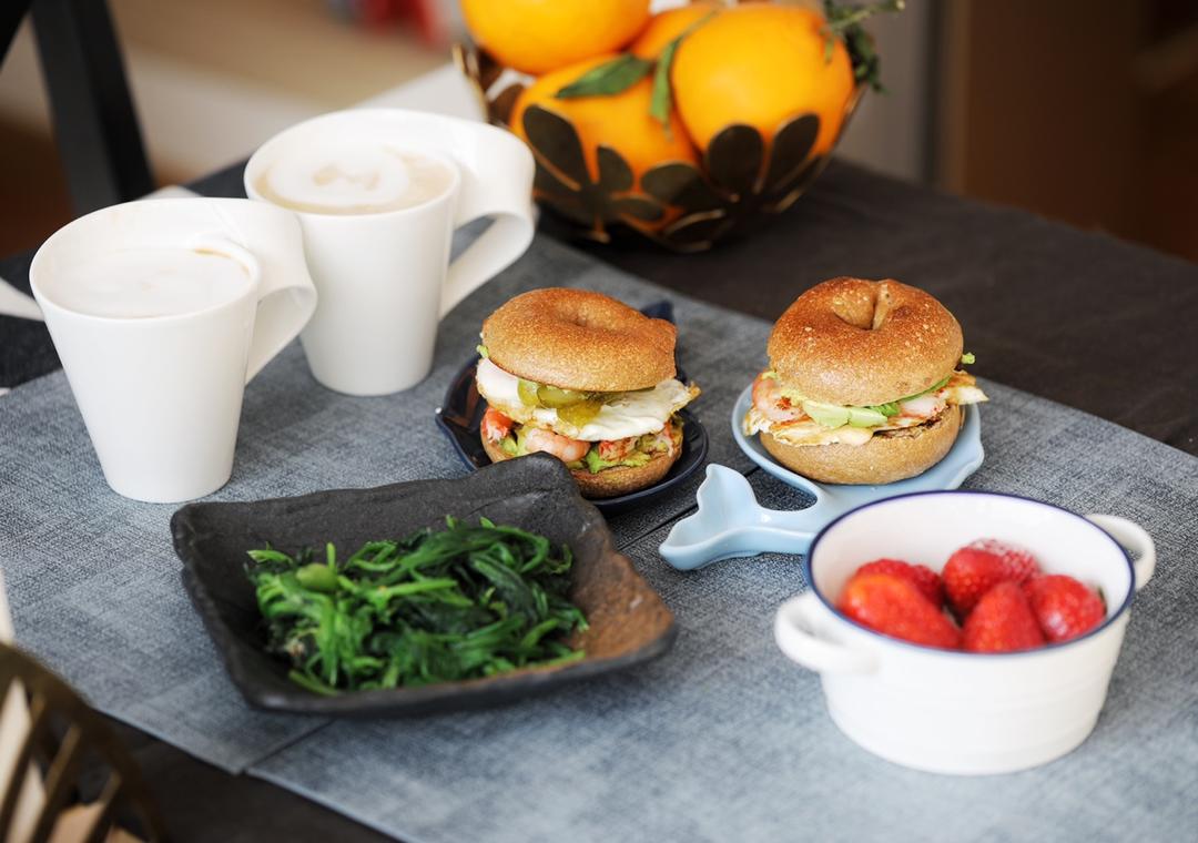 意大利火腿奶酪贝果三明治,羽衣甘蓝卧蛋,草莓,拿铁咖啡。
