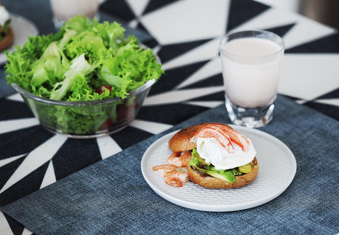 一个贝果做了两个开放三明治,菠菜黄豆和牛奶加少许奶茶口味的蛋白粉做了一大杯green sm...