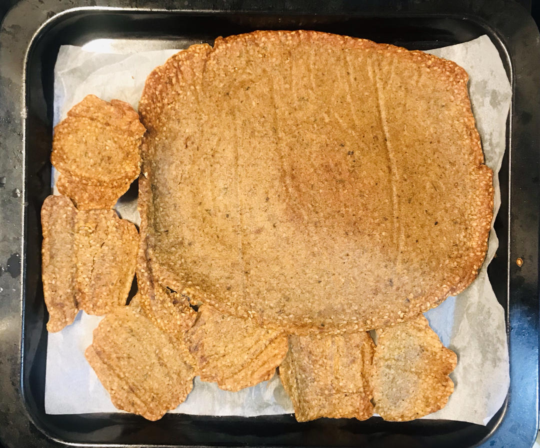 做闪电泡芙剩下好多蛋白(172g),参考了几个做芝麻薄饼的方子,以及根据家里现有的原材料,还是打算做咸口的。共加了70g...
