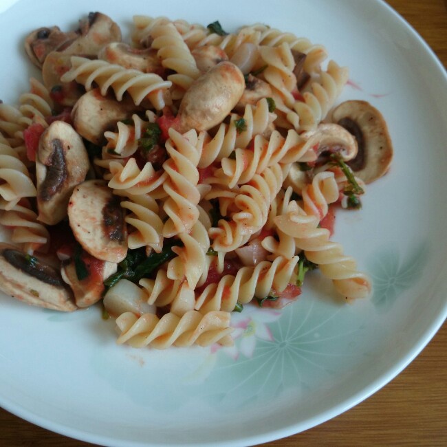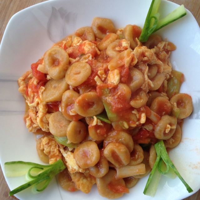 小妞儿周六午餐:西红柿鸡蛋炒胡萝卜酒窝面+凤梨哈密瓜水果拼盘