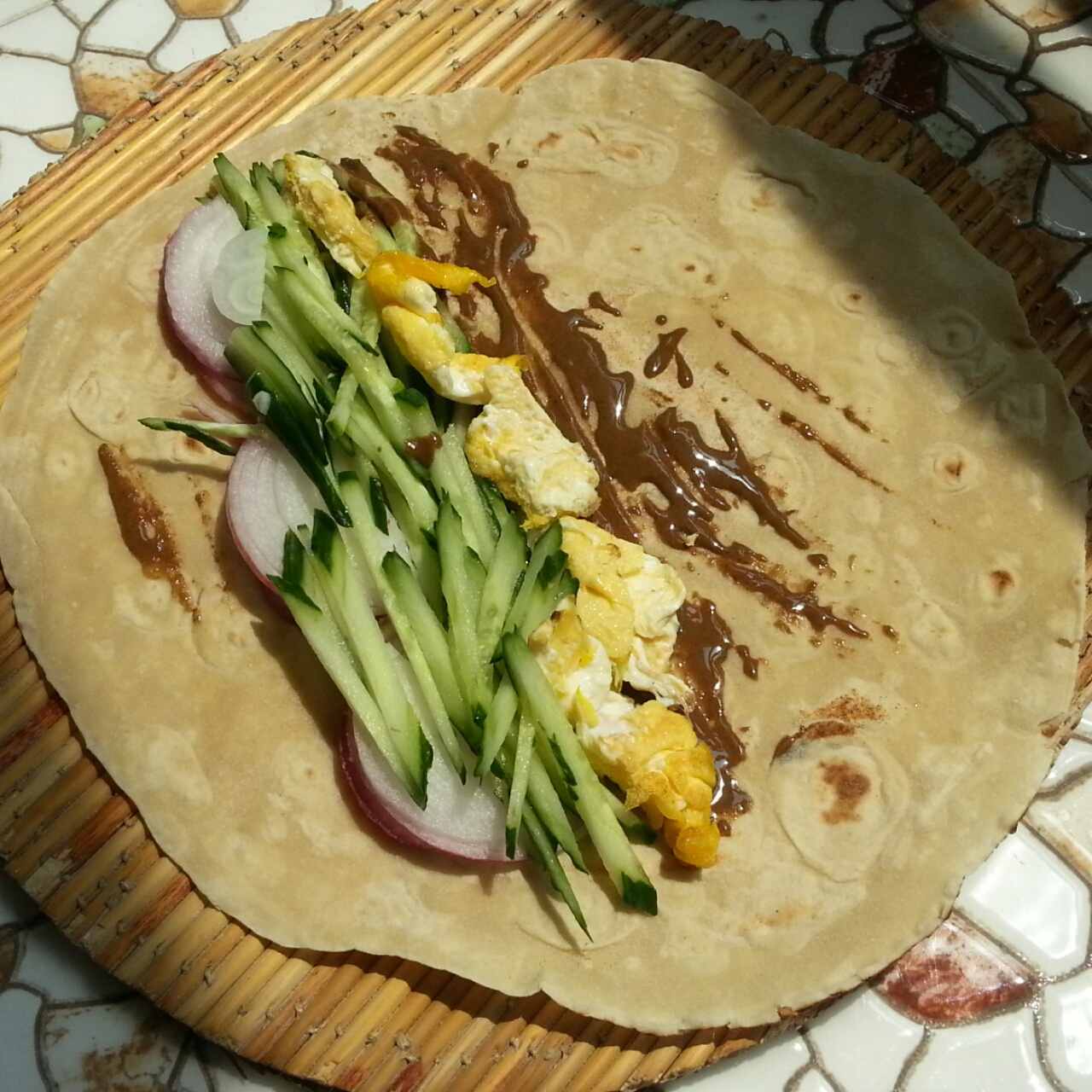 芝麻酱打底…铺上黄瓜洋葱和鸡蛋…几乎就是甜的,没什么盐,嗓子又想疼起来了…