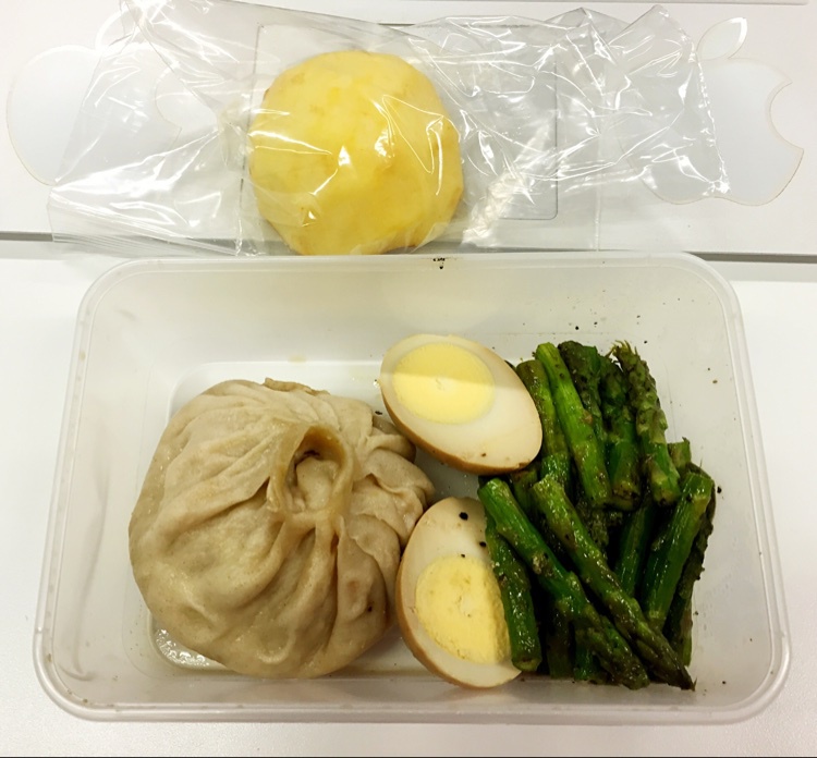 白菜猪肉包+卤蛋+橄榄油香煎芦笋,水果是半个苹果…最近没怎么做饭,简单吃点儿…