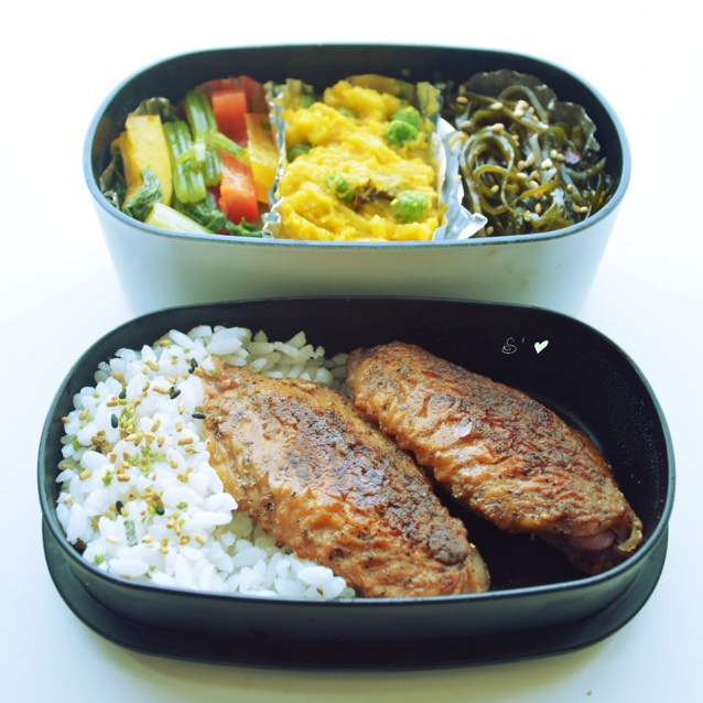 今日のお弁当:鸡翅、彩椒拌芹菜、南瓜红薯沙拉、酸辣海带丝。才吃饭,特么饿死我了!
